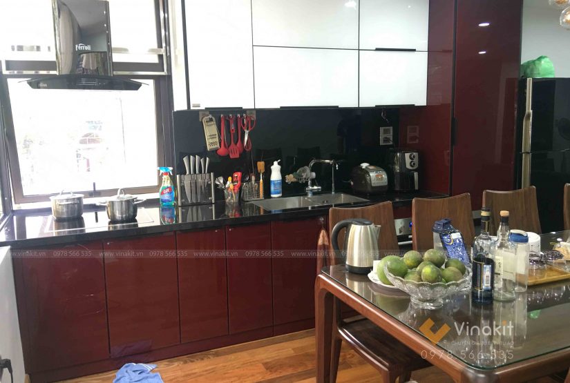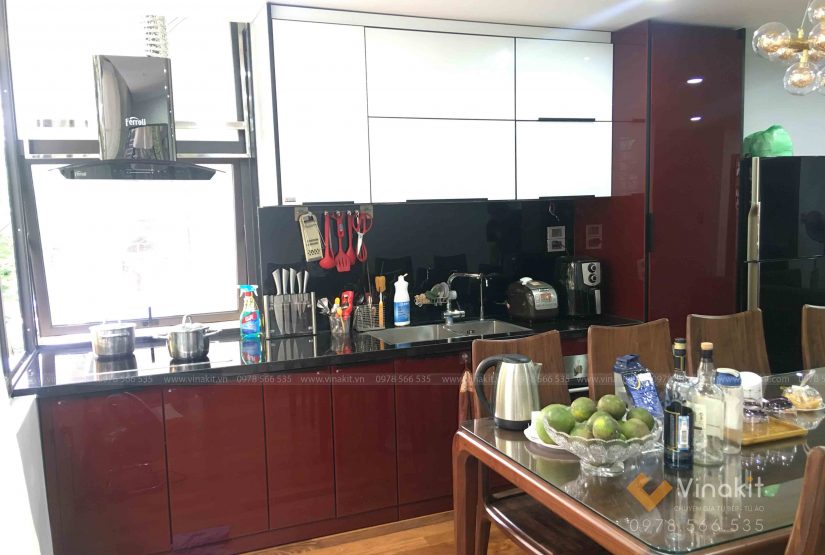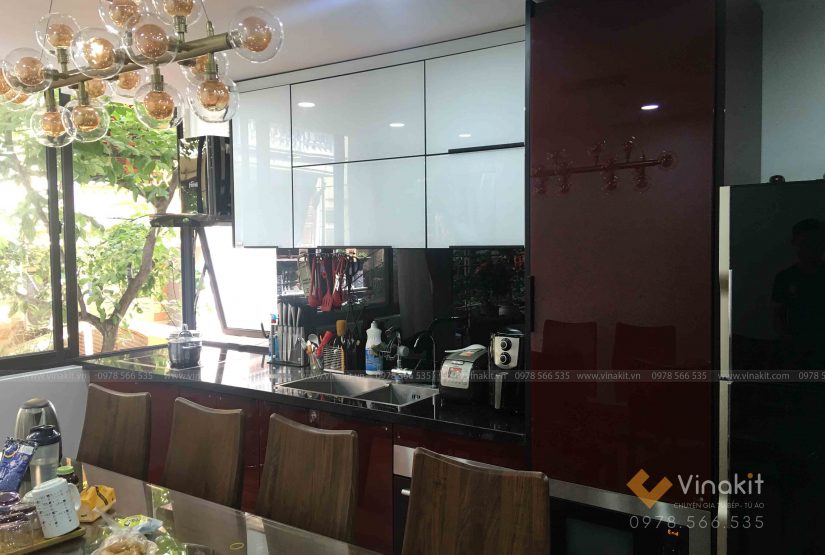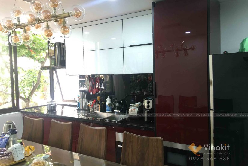 Với tông màu đỏ cherry kết hợp với màu trắng đặc biệt mà chỉ có kính cường lực siêu trong của Vinakit mới tạo màu được, bộ tủ bếp trở nên nổi bật hơn bao giờ hết.