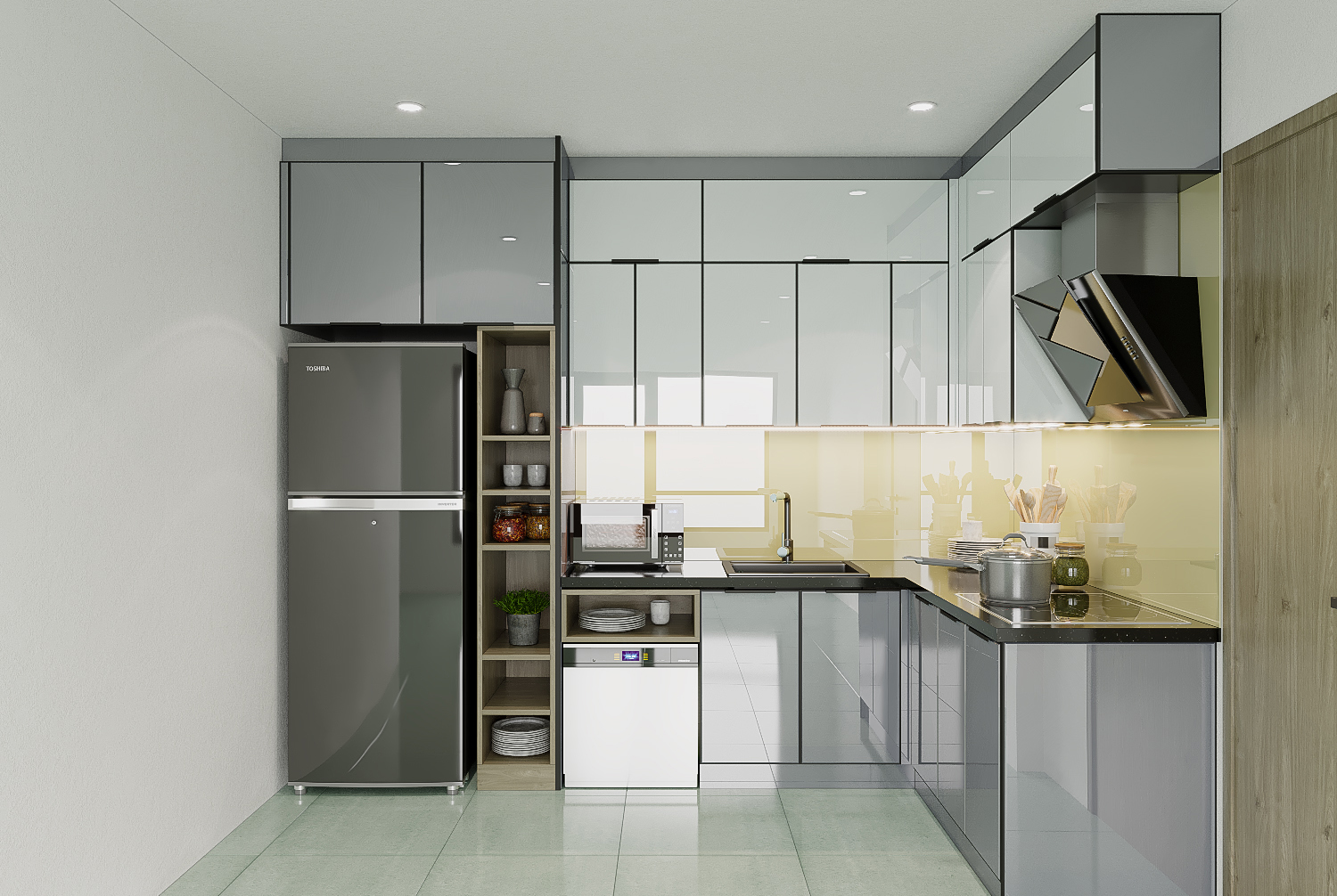 Kiểu dáng: Chữ L có tủ kịch trần và tủ lạnh